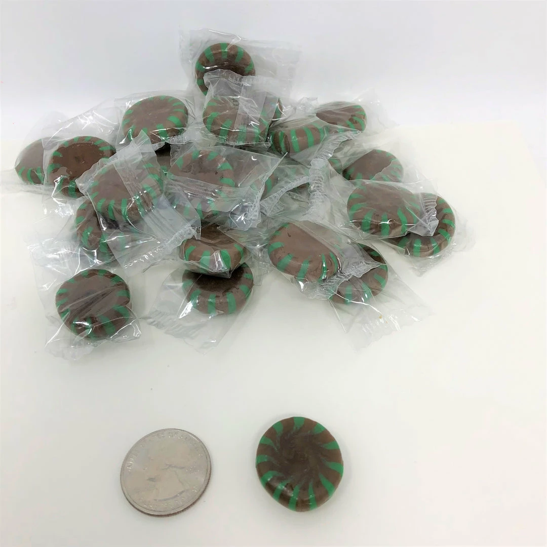 Chocolate brown and green striped Starlight Mints. Individually wrapped hard lozenger-type candies with each candy having both a chocolate and refreshing mint flavor. This listing is for a bulk 2 pound bag of Sunrise chocolate starlight mints.